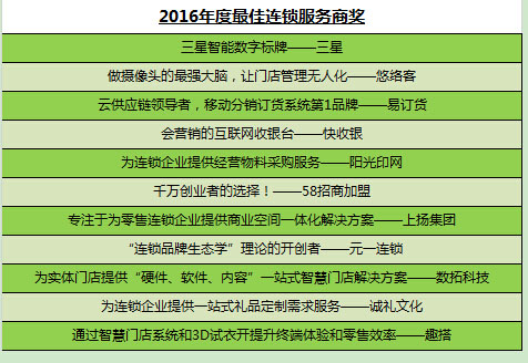 本次峰會(huì)現(xiàn)場(chǎng)的頒獎(jiǎng)環(huán)節(jié)更為引人矚目。以名創(chuàng)優(yōu)品、西貝、漢堡王、海底撈、百果園等為代表的全國(guó),乃至全球的知名品牌商榮登“2016年度中國(guó)高成長(zhǎng)連鎖50強(qiáng)”榜單;“2016年度更具潛力連鎖之星”則分別被望湘園、永和豆?jié){、新加坡媽媽烤包、喜來(lái)快遞、大腦地圖等優(yōu)質(zhì)連鎖企業(yè)奪得;開心麗果、漢堡王、名創(chuàng)優(yōu)品、麥多、皇家雞排等則獲得“2016年十大更值得加盟連鎖品牌”;而“2016年十大更受消費(fèi)者喜愛門店”則“花落”鯊魚先生博物館、木屋燒烤、cityzoo、popmart、精悅?cè)嘏M艿壬碳?好享家、新發(fā)則、凱蘭帝等為代表的連鎖行業(yè)“新勢(shì)力”毫無(wú)疑問(wèn)地拿到了“2016年度商業(yè)模式創(chuàng)新獎(jiǎng)”。