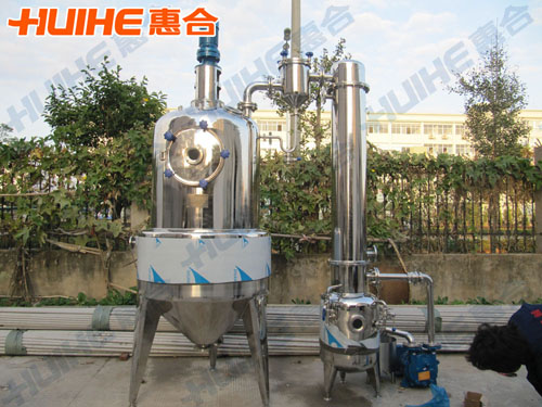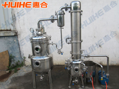 真空減壓濃縮器(罐)是將提取好的液加熱沸騰,蒸發(fā)水份,在被蒸發(fā)的二次蒸汽中帶有有效成份的泡沫在汽液分離器中分離出來(lái)回流缸內(nèi)。